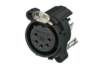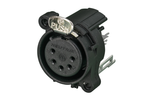 Панельный разъем XLR, 5-и контактный <гнездо/мама>, А-серия, фланец А-типа, вертикальная установка PCB, компактный корпус из термопластика, заземление: отдельный контакт заземления - корпус разъема - корпус установки соединены, контакты - покрытие золото, под пайку.