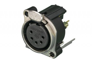 Панельный разъем XLR, 5-и контактный <гнездо/мама>, B-серия, металлический фланец А-типа, дополнительная защита от RF, вертикальная установка PCB, компактный пластиковый корпус, заземление: отдельный контакт заземления - корпус разъема - корпус установки соединены, контакты - покрытие золото, под пайку.