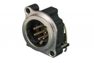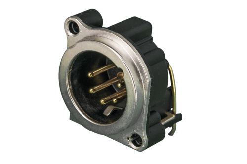 Панельный разъем XLR, 5-и контактный <штекер/папа>, B-серия, металлический фланец А-типа, дополнительная защита от RF, горизонтальная установка PCB, компактный корпус из термопластика, заземление: отдельный контакт заземления - корпус разъема - корпус установки соединены, контакты - покрытие золото, под пайку.