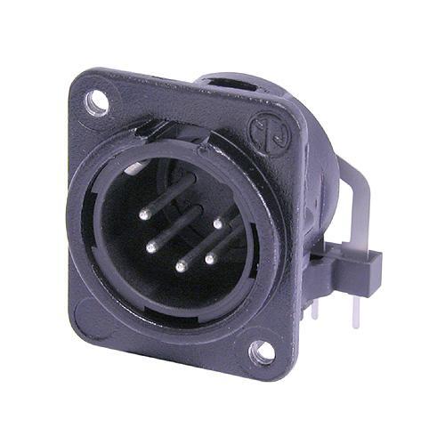 Панельный разъем XLR, 5-и контактный <штекер/папа>, DL-серия, фланец D-типа, горизонтальная установка PCB, черный хромированный металлический корпус, контакты - покрытие серебро, монтажные отверстия M3, под пайку.
