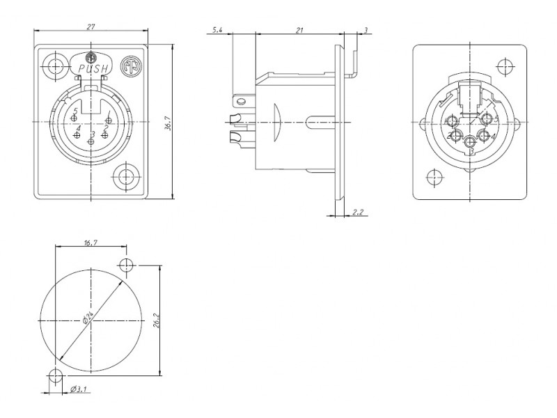 5-ти пиновый панельный разъём XLR "папа". Никелированный фланец "P" типа.