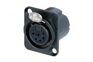 Панельный разъем XLR, 6-и контактный <гнездо/мама>, DLX-серия, фланец D-типа, черный компактный хромированный металлический корпус с двойным заземляющим контактом, обеспечивающий отличную защиту от RF, контакты - покрытие золото, под пайку.