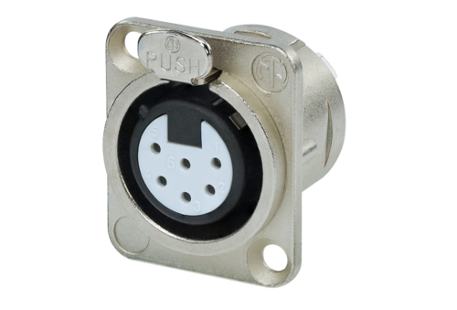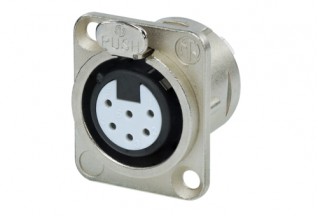 Панельный разъем XLR, 6-и контактный <гнездо/мама>, DL-серия, фланец D-типа, металлический никелированный корпус, контакты - покрытие серебро, под пайку. Эквивалентно расположению контактной группы Switchcraft.