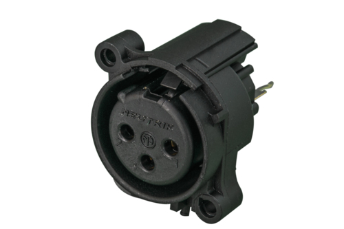 Панельный разъем XLR, 3-х контактный <гнездо/мама>, АА-серия, фланец А-типа, вертикальная установка PCB, пластиковый корпус, заземление: без заземляющего контакта, удерживающая пружина вместо защелки, контакты - покрытие золото, под пайку.