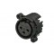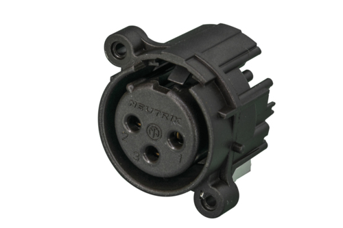 Панельный разъем XLR, 3-х контактный <гнездо/мама>, А-серия, фланец А-типа, боковая левая установка PCB, компактный пластиковый корпус, заземление: контакт 1 - на массу и на корпус ответного разъема, удерживающая пружина вместо защелки, контакты - покрытие золото, под пайку.