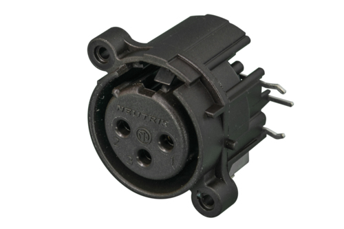 Панельный разъем XLR, 3-х контактный <гнездо/мама>, А-серия, фланец А-типа, боковая правая установка PCB, компактный пластиковый корпус, заземление: контакт 1 - на массу и на корпус ответного разъема, удерживающая пружина вместо защелки, контакты - покрытие золото, под пайку.