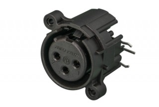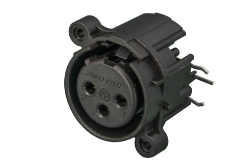 Панельный разъем XLR, 3-х контактный <гнездо/мама>, А-серия, фланец А-типа, боковая правая установка PCB, компактный пластиковый корпус, заземление: без заземляющего контакта, удерживающая пружина вместо защелки, контакты - покрытие золото, под пайку.