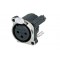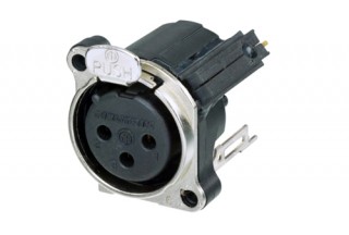 Панельный разъем XLR, 3-х контактный <гнездо/мама>, переключающие контакты, B-серия, металлический фланец А-типа, дополнительная защита от RF, вертикальная установка PCB, компактный пластиковый корпус, заземление: отдельный контакт заземления соединен с корпусом разъема и заземлением панели установки, контакты - покрытие золото, под пайку.