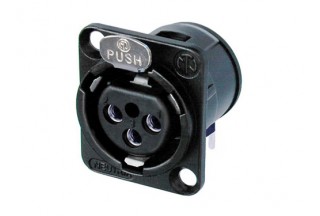 Панельный разъем XLR, 3-х контактный <гнездо/мама>, D-серия, фланец D-типа, горизонтальная установка PCB, черный хромированный металлический корпус, контакты - покрытие серебро, под пайку.
