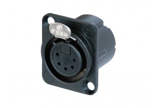 Панельный разъем XLR, 5-и контактный <гнездо/мама>, DLX-серия, фланец D-типа, черный компактный хромированный металлический корпус с двойным заземляющим контактом, обеспечивающий отличную защиту от RF, контакты - покрытие золото, под пайку.