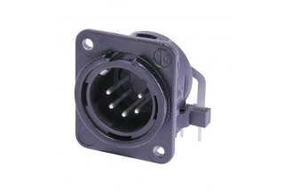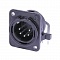 Панельный разъем XLR, 5-и контактный <штекер/папа>, DL-серия, фланец D-типа, горизонтальная установка PCB, черный хромированный металлический корпус, контакты - покрытие серебро, монтажные отверстия M3, под пайку.