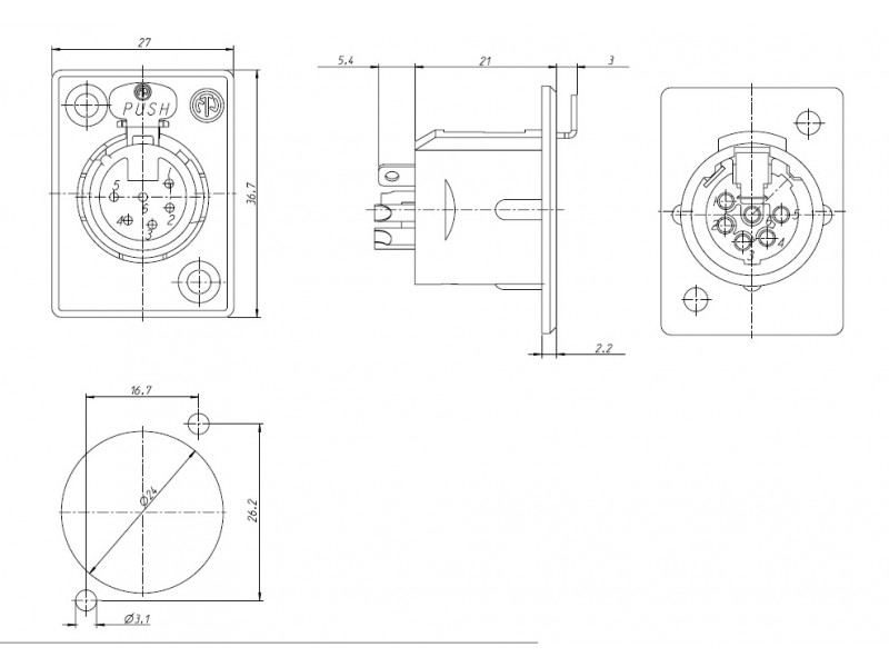 6-ти пиновый панельный разъём XLR "мама". Никелированный фланец "P" типа.